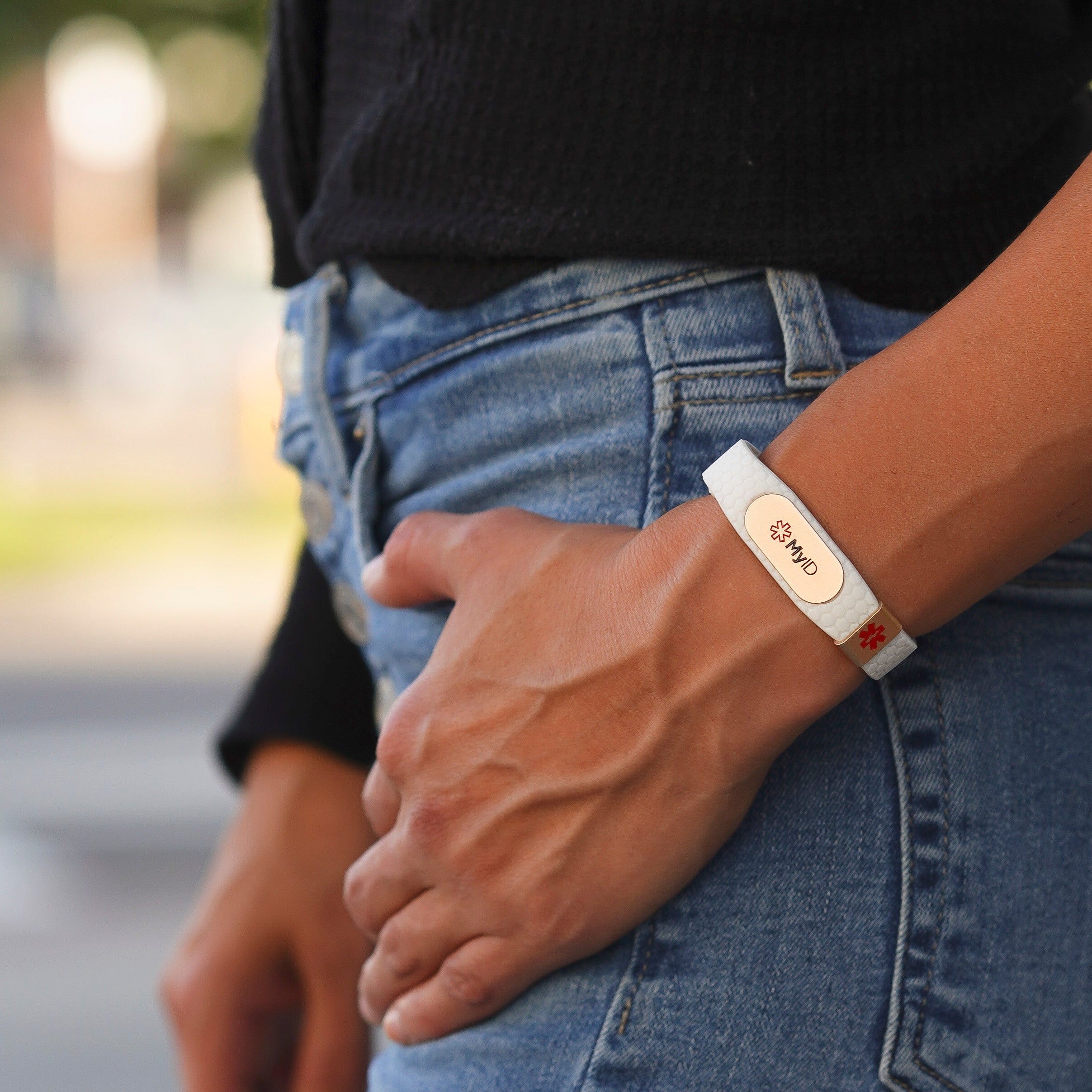 Interchangeable style with snap-tuck design. Silicone band, metal pod—swap band colors to match any outfit while keeping the same medical ID.